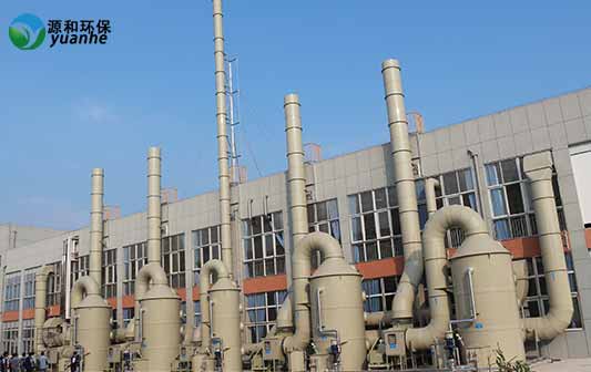 立式洗滌塔,有害的廢氣從塔體的下部進入,立式洗滌塔內部設有一定高度的填料層廢氣自下而上穿過填料層,最后從塔頂排出。同時從塔體的上部設有噴淋系統,利用清水作循環吸收液,循環水從塔體的上部的布水器噴淋至填料層潤濕填料表面形成流動的液膜。填料層內氣、液兩相呈逆流流動,氣液兩項在塔內逆流接觸,利用有害廢氣在吸收劑中的一定的溶解度,可溶的組分不斷溶入吸收液中,達到降低氣體中有害組分含量的目的。配添加適當量的藥劑,有害廢氣不斷被吸收或是被化學反應去除掉,因此在上升氣流中的濃度愈來愈低,到塔頂時達到吸收要求排出塔外。